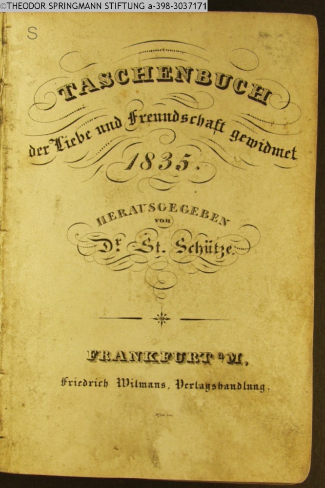 TASCHENBUCH / der Liebe und Freundschaft gewidmet / 1835. / HERAUSGEGEBEN / von / Dr. St. Schütze. / FRANKFURT a/M, / Friedrich Wilmans, Verlagshandlung