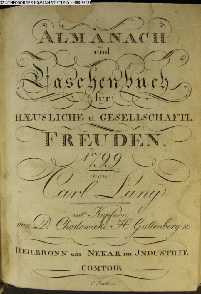ALMANACH / und / Taschenbuch / für / HAEUSLICHE / u. GESELLSCHAFTL. / FREUDEN. / 1799. / von / Carl Lang / mit Kupfern / von D. Chodowieki, H. Guttenberg & / HEILBRONN an NEKAR im INDUSTRIE / COMPTOIR