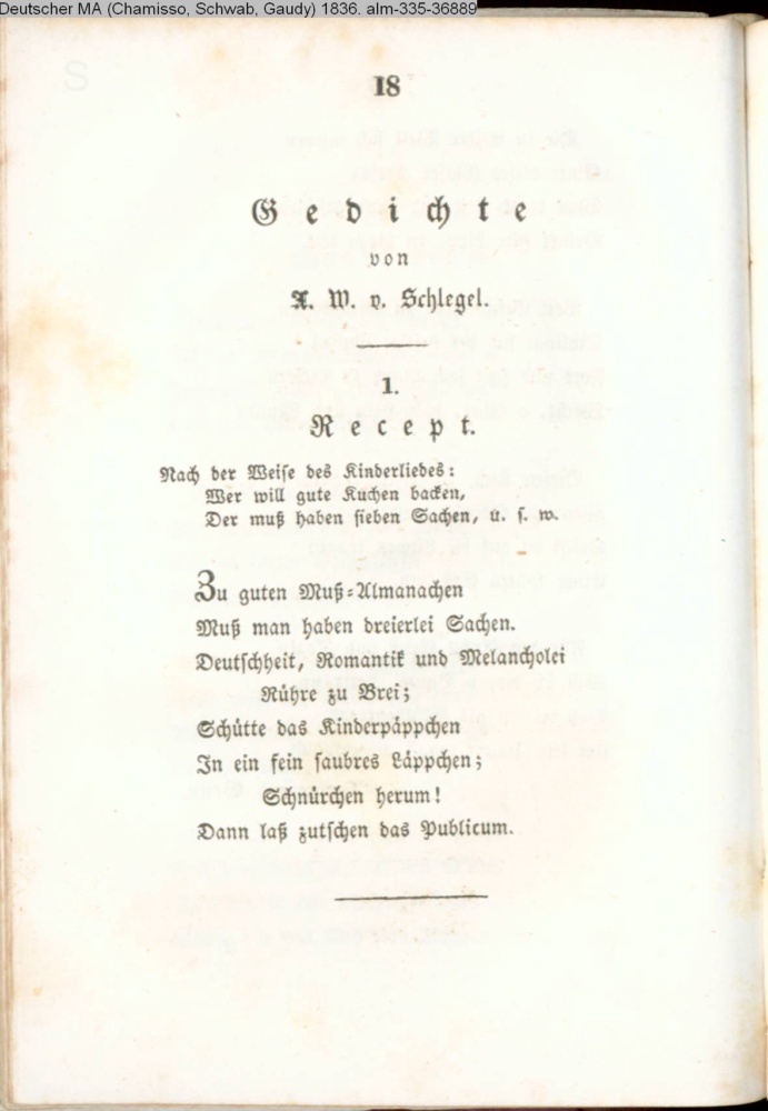 Zu guten Muß-Almanachen / Muß man haben dreierlei Sachen. / Deutschheit, Romantik und Melancholei / Rühre zu Brei;…