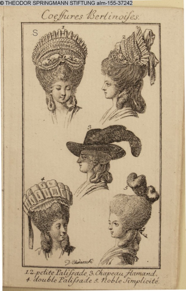 Coeffures Berlinoises / 1.2. petite Palisade, 3. Chapeau flammand. / 4. double Palisade 5. Noble Simplicité
