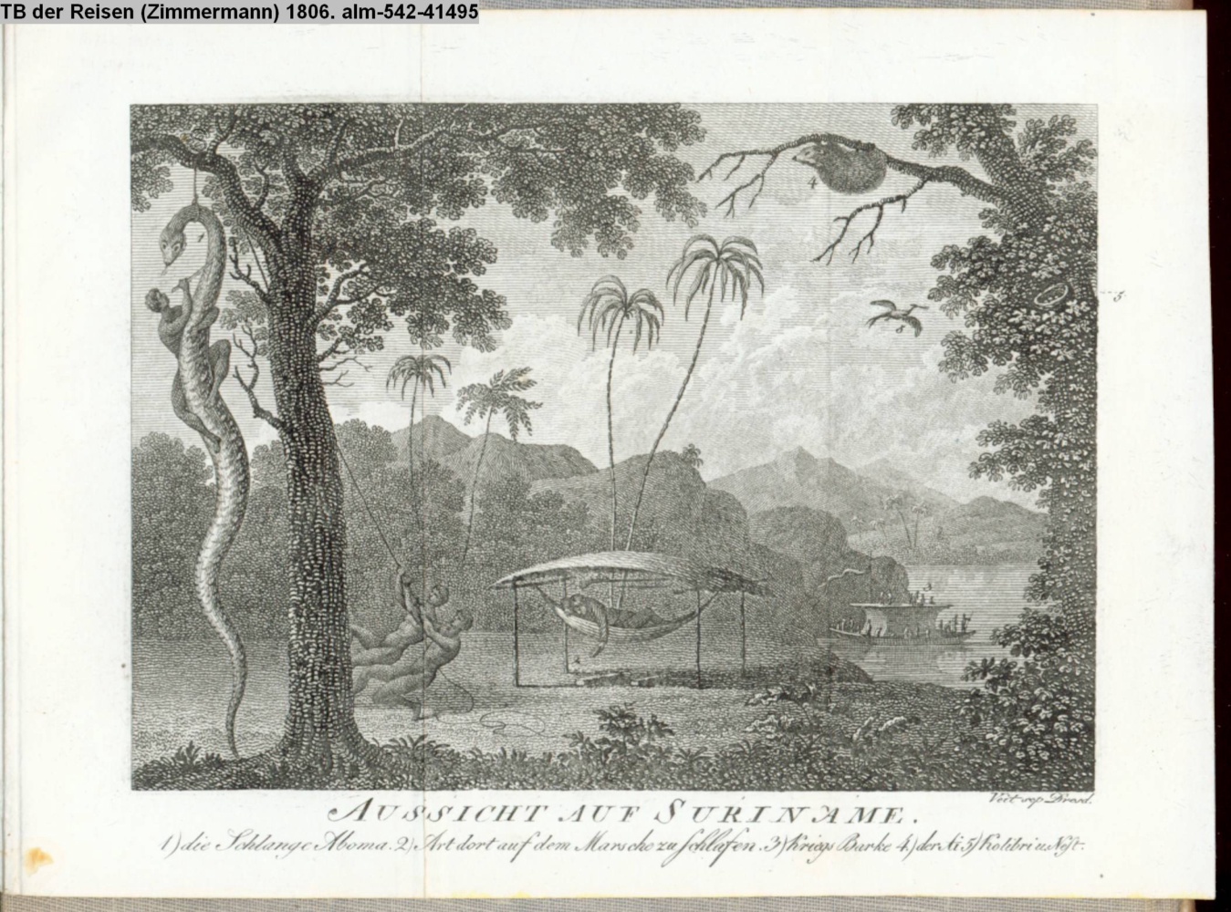 AUSSICHT AUF SURINAME. / 1) Schlange Aboma. 2) Art dort auf dem Marsche zuschlafen. 3) KriegsBarke. 4) der Ai. 5) Kolibri u. Nest