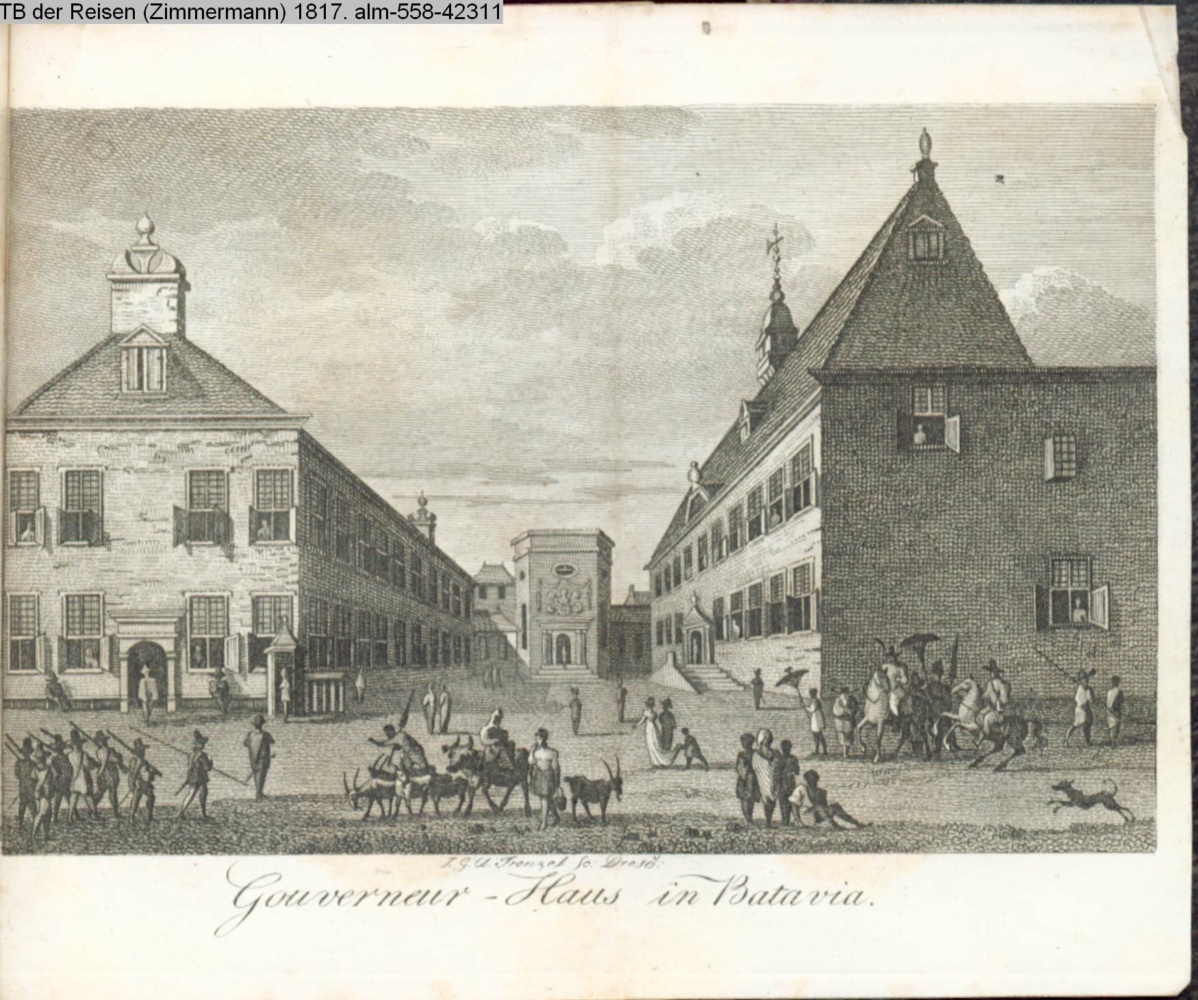 lt. G-Verz: aus Nieuhofs Zee en Land-Reizen d.i.: Nieuhof, Johan f: Zee- en Lant-Reise door verscheide Gewesten van Oostindien, behelzende veele zeldzaame en wonderlijke voorvallen en geschiedenissen. Beneffens een beschrijving van lantschappen, dieren, gewassen, draghten, zeden en godsdienst der inwoonders: E inzonderheit een wijtloopig verhael der Stad Batavia. Amsterdam: de Weduwe van Jacob van Meurs, 1682