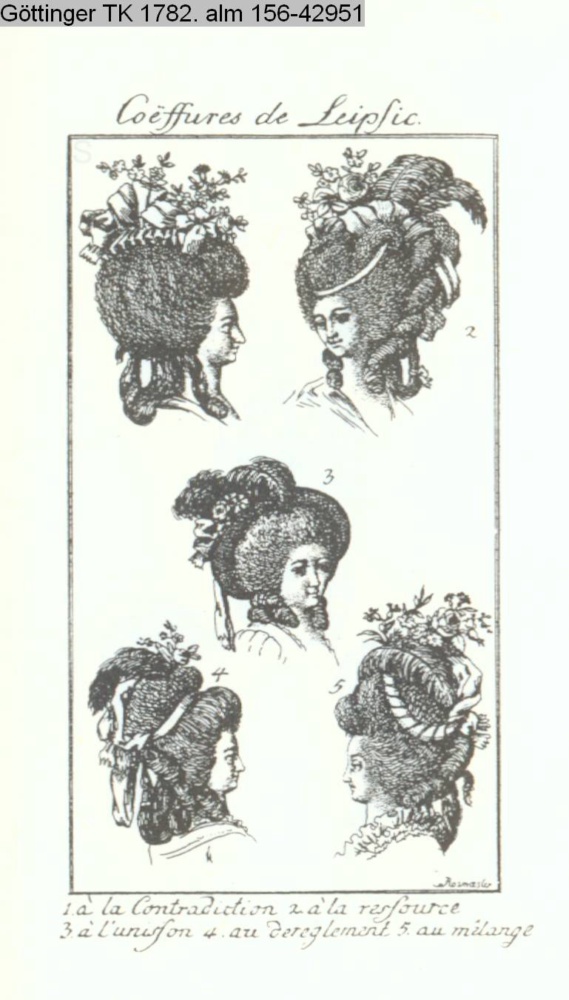 Coëffures de Leipsic. / 1. à la Contradiction 2. à la ressource / 3. à l'unisson 4. au dérèglement 5. au mélange.