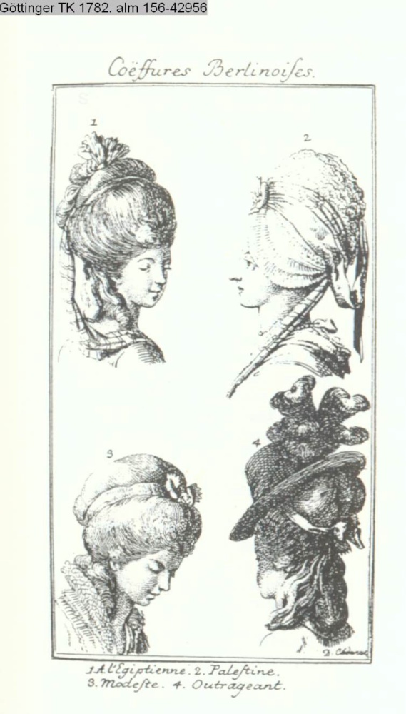 Coëffures Berlinoises. / 1. A l'Egiptienne. 2. Palestine. / 3. Modeste. 4. Outrageant
