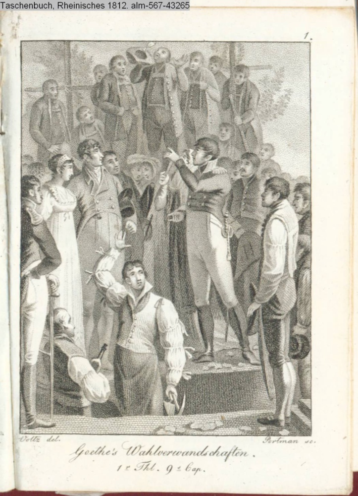 Graphik vor dem Kalendarium paginiert 1. Illustration zu »Die Wahlverwandschaften« [1. Teil, 9. Kapitel] von J. W. von Goethe, Tübingen 1809; s. Textbezug
