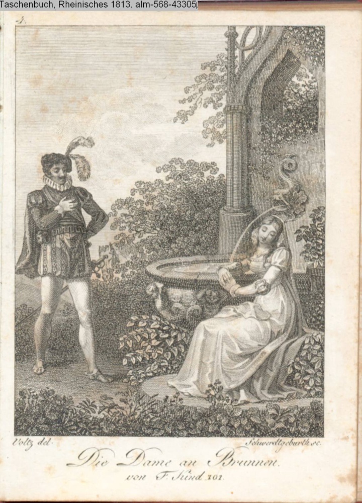 Graphik im Kalendarium paginiert 4. Illustration zu »Die Dame am Brunnen« von Fr. Kind in: Taschenbuch, Rheinisches 1812;