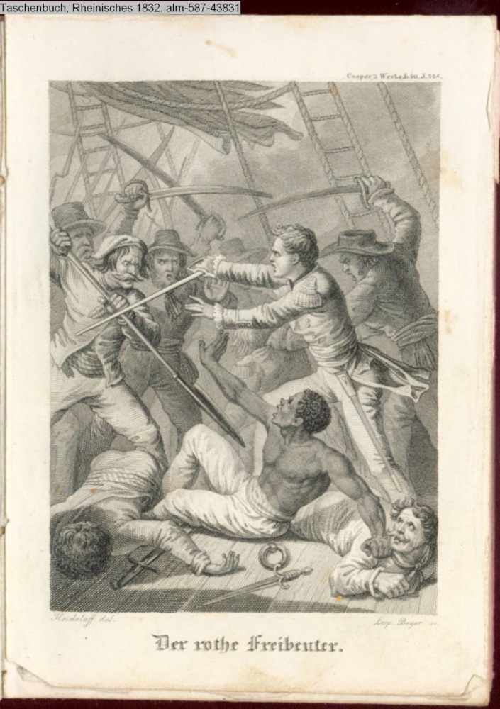 Illustration zu »Der rothe Freibeuter« von J. F. Cooper; am oberen rechten Rand: Cooper's Werke B. 40. S. 328 s. Textbezug