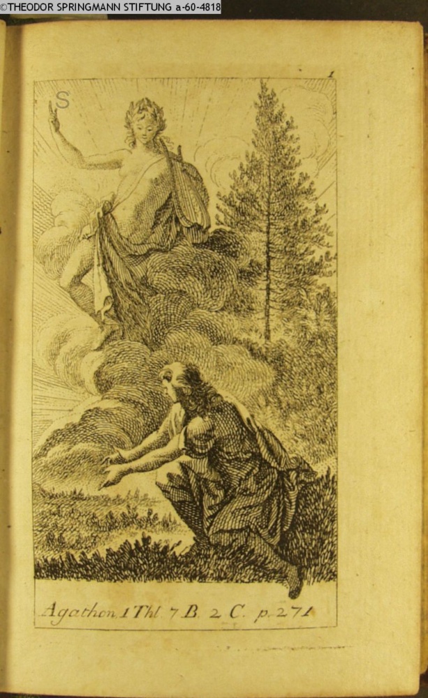 Graphik im Kalendarium. paginiert 1. # Bezeichnung an 6 von 12 Graphiken der Suite. Illustration zu »Agathon« von C. M. Wieland