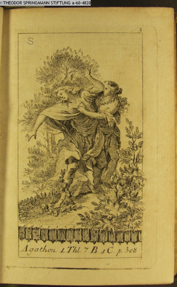Graphik im Kalendarium. paginiert 3. # Bezeichnung an 6 von 12 Graphiken der Suite. Illustration zu »Agathon« von C. M. Wieland