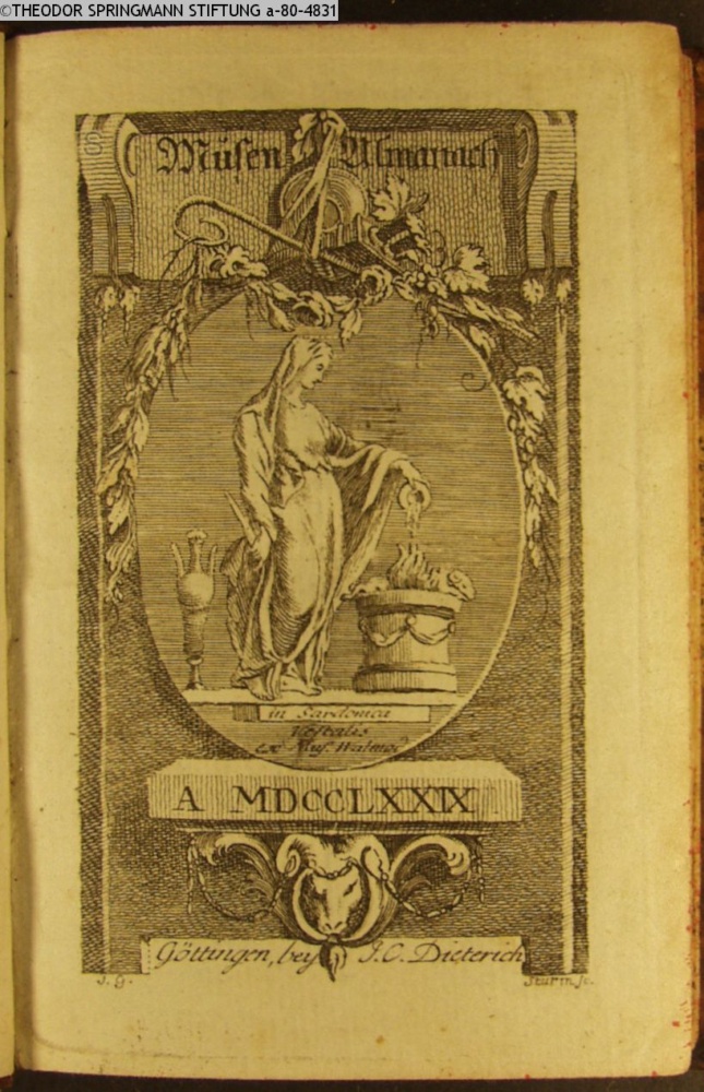 Musen Almanach / in Sardonica / Vestalis / ex Mus. Walmod. / A MDCCLXXIX / Göttingen, bey J. C. Dieterich