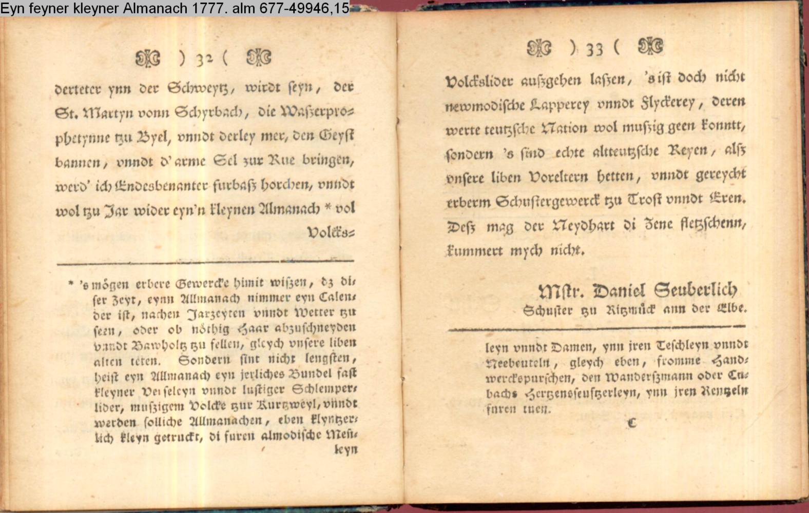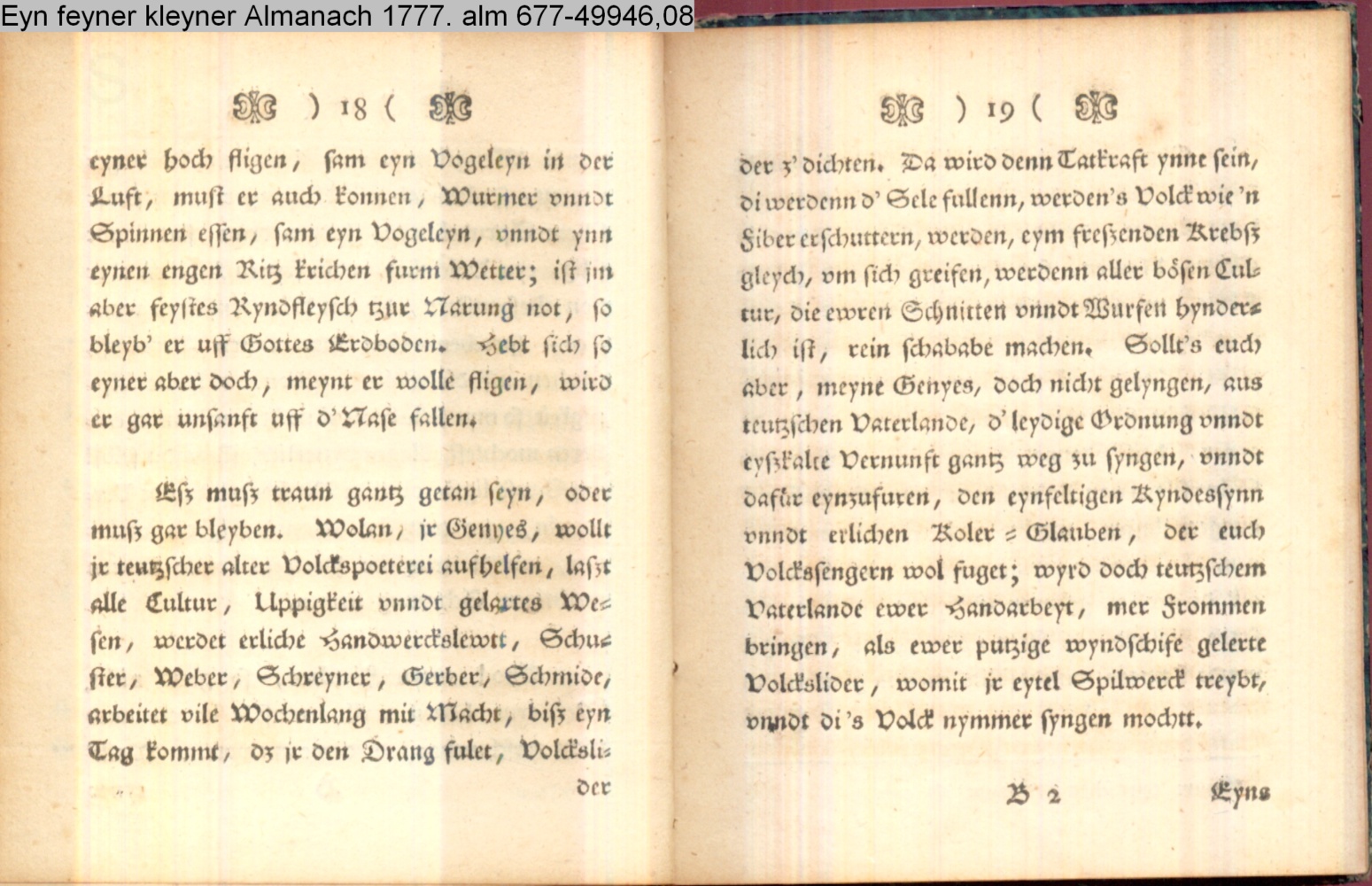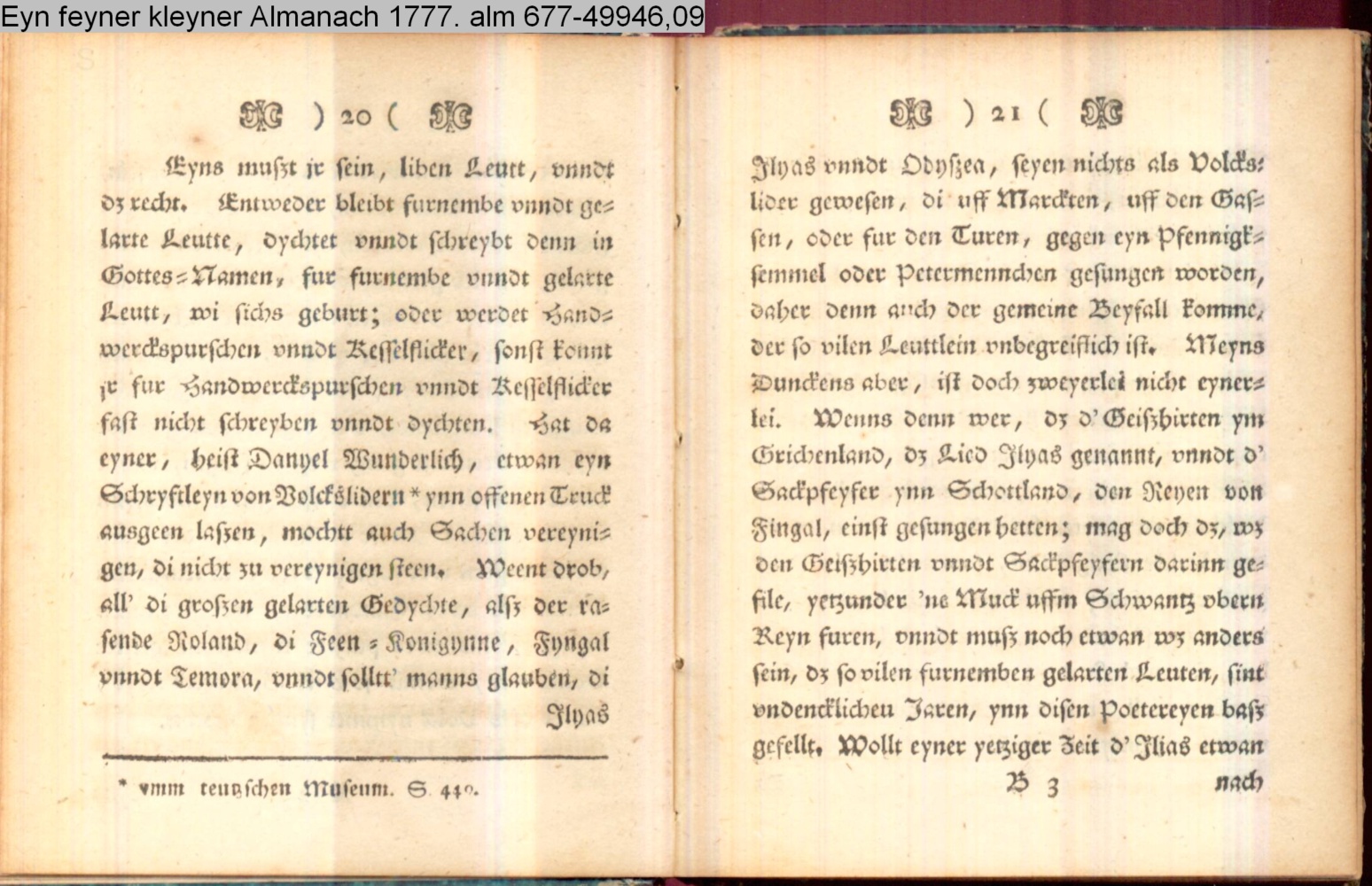 Vorwort lt. L/R 203: »Eine geistreiche Antwort auf Bürgers in seinem Aufsatz »Aus Daniel Wunderlichs Buch« enthaltene, überschwengliche Anpreisung der Volkspoesie. Die Vorreden beider Bändchen greifen Bürgers Argumente auf und treiben damit ihren Scherz. Einige der Poesien sind vortreffliche Parodien echter Volkslieder, zum Teil ist ihnen dichterischer Wert nicht abzusprechen.« s. hierzu: G. A. Bürger »Aus Daniel Wunderlichs Buch« in: Deutsches Museum 1776 1. Bd. S. 440; sowie Bürgers Reaktion auf Nicolais Almanach erstmals gedruckt in: »Aus Daniel Wunderlich's Buche. III. Zur Beherzigung an die Philosophunculos« in: G. A. Bürger's sämmtliche Werke. Herausgegeben von Karl v. Reinhard. Sechster Band. Vollendete, rechtmäßige Ausgabe. Berlin. Bei E. H. G. Christiani. 1824 S. 194-199