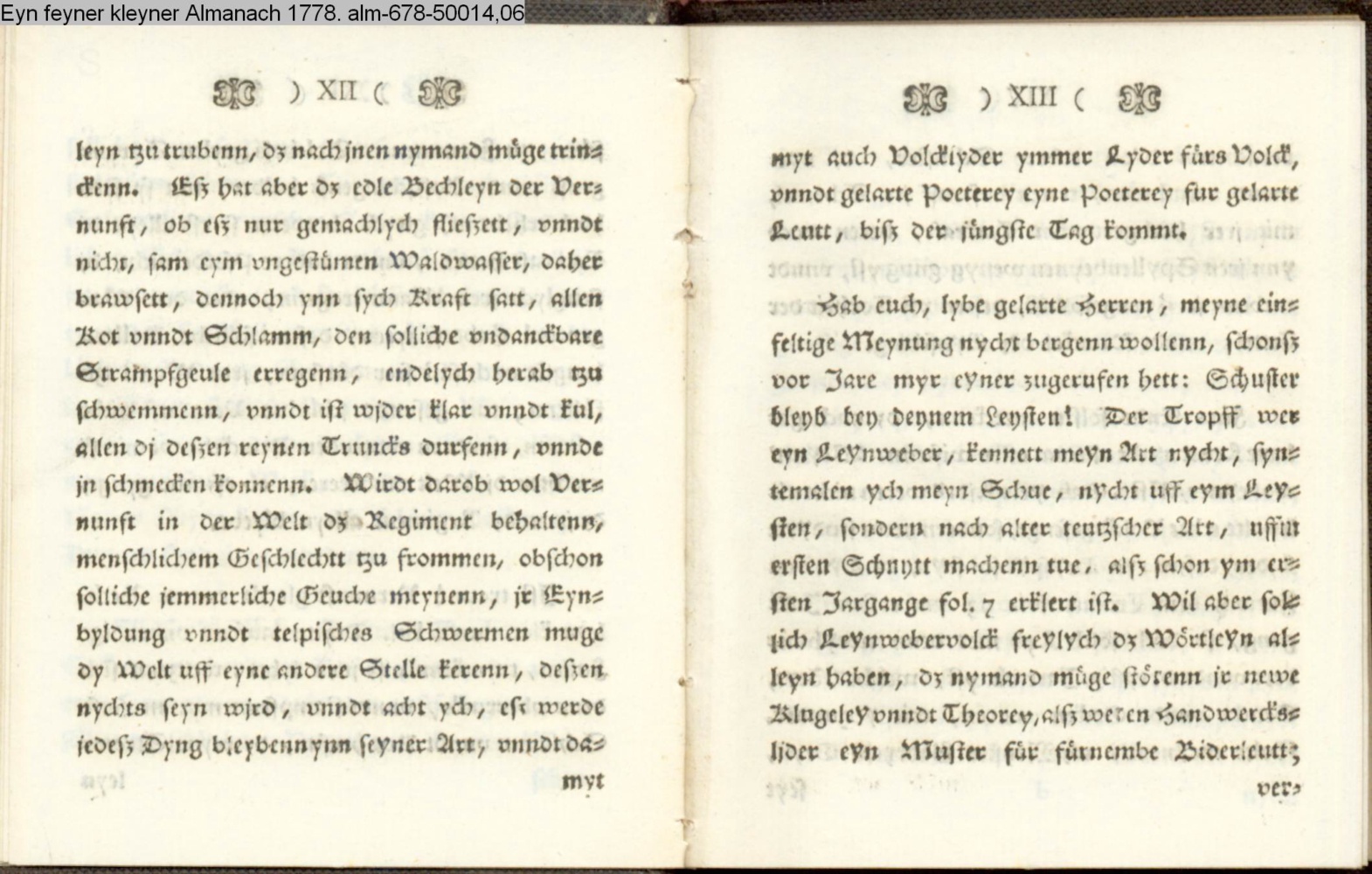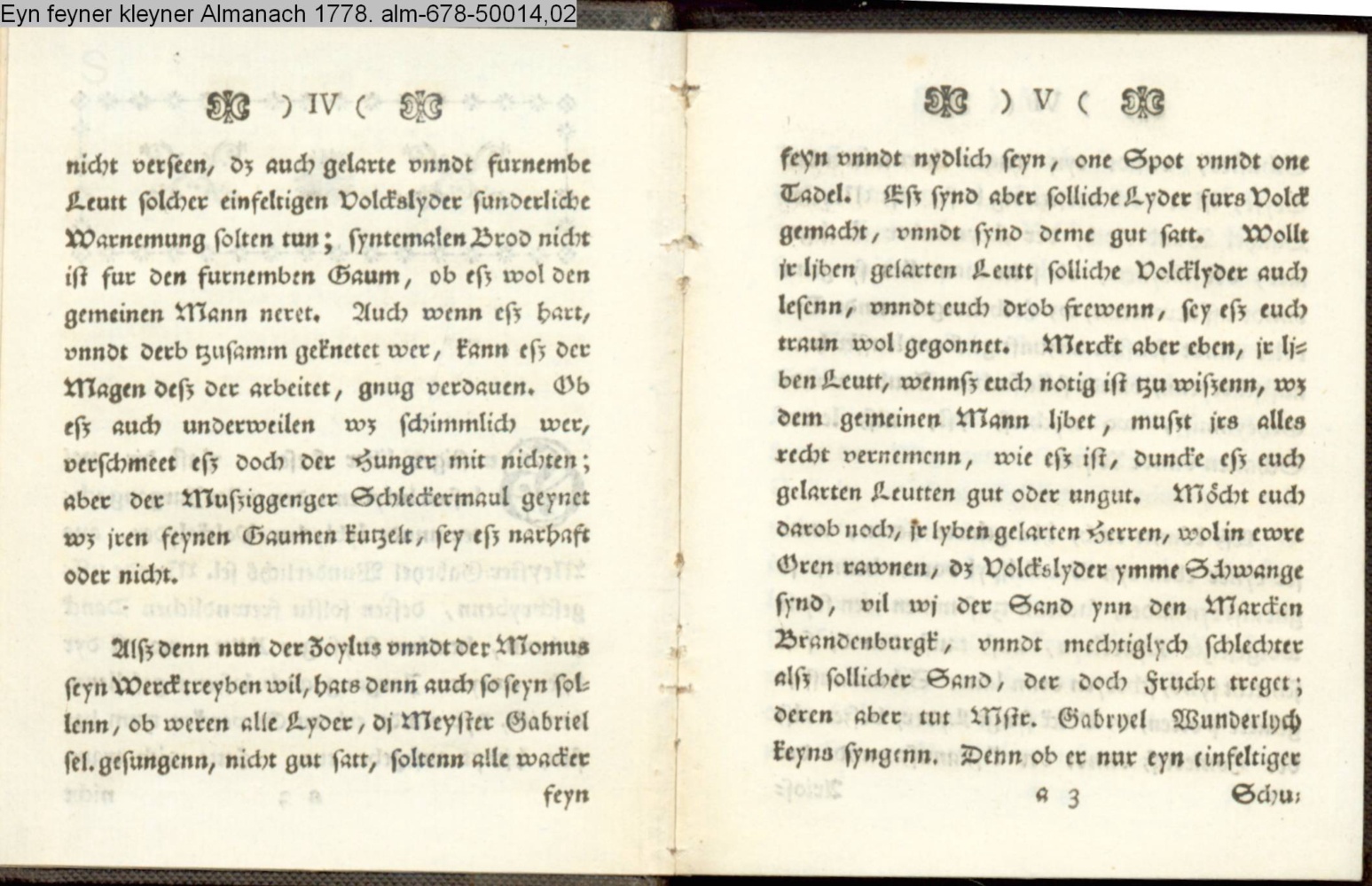 Vorwort lt. L/R 203: »Eine geistreiche Antwort auf Bürgers in seinem Aufsatz »Aus Daniel Wunderlichs Buch« enthaltene, überschwengliche Anpreisung der Volkspoesie. Die Vorreden beider Bändchen greifen Bürgers Argumente auf und treiben damit ihren Scherz. Einige der Poesien sind vortreffliche Parodien echter Volkslieder, zum Teil ist ihnen dichterischer Wert nicht abzusprechen.« s. hierzu: G. A. Bürger »Aus Daniel Wunderlichs Buch« in: Deutsches Museum 1776 1. Bd. S. 440; sowie Bürgers Reaktion auf Nicolais Almanach erstmals gedruckt in: »Aus Daniel Wunderlich's Buche. III. Zur Beherzigung an die Philosophunculos« in: G. A. Bürger's sämmtliche Werke. Herausgegeben von Karl v. Reinhard. Sechster Band. Vollendete, rechtmäßige Ausgabe. Berlin. Bei E. H. G. Christiani. 1824 S. 194-199