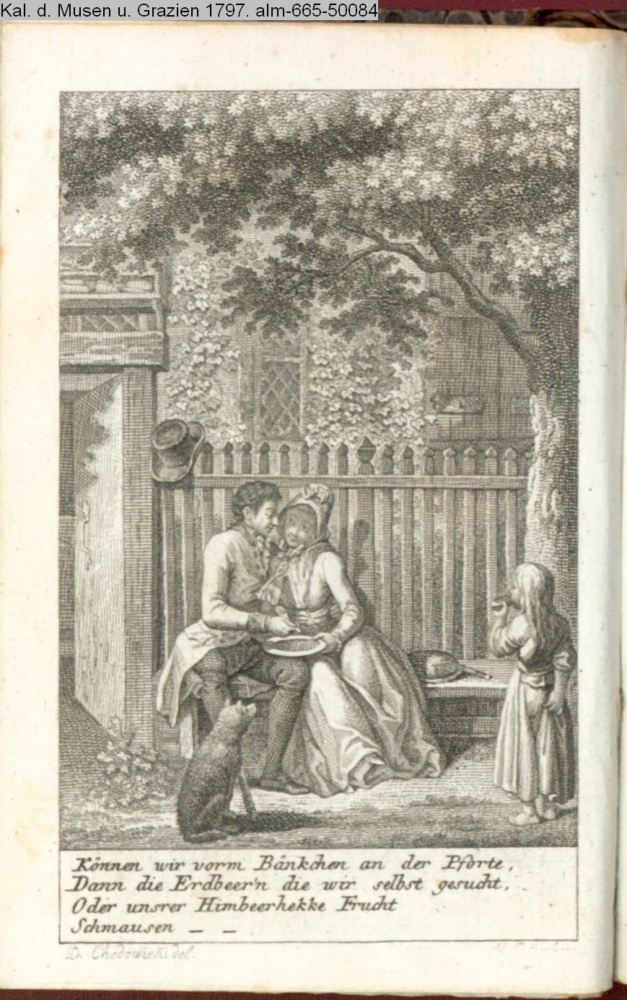 Können wir vorm Bänkchen an der Pforte, / Dann die Erdbeer'n, die wir selbst gesucht, / Oder unsrer Himbeerhekke Frucht / Schmausen
