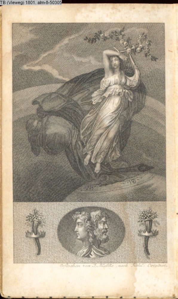 INr 50307, Obj 5: Das abgeschiedene Jahrhundert sinkt tief verhüllt in die Nacht der Vergangenheit; das heraufschwebende trägt eine mit Blumen bekränzte Leier.