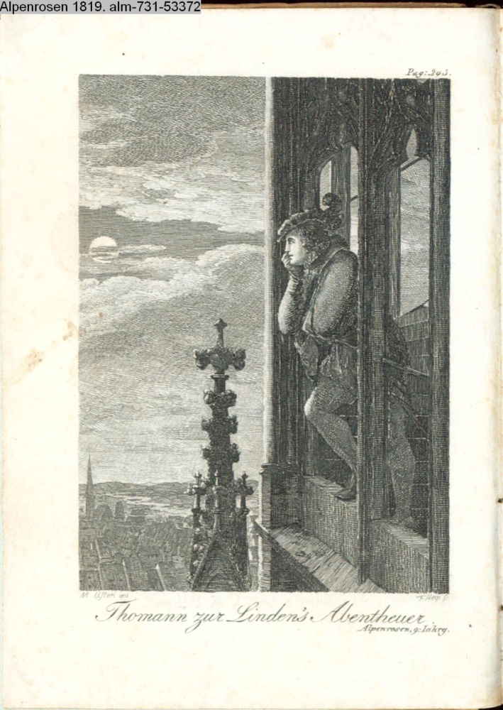 Titelgraphik paginiert Pag. 293: Illustration zu »Thomann Zur Linden's Abentheuer auf dem großen Schießen zu Straßburg 1576« von J. M. Usteri