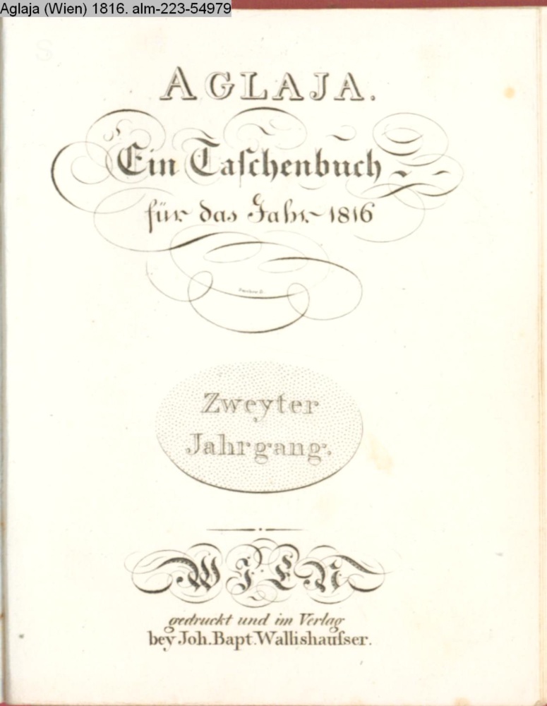 AGLAJA. / Ein Taschenbuch / für das Jahr 1816 / Zweyter / Jahrgang. / WIEN / gedruckt und im Verlag / bey Joh. Bapt. Wallishauser