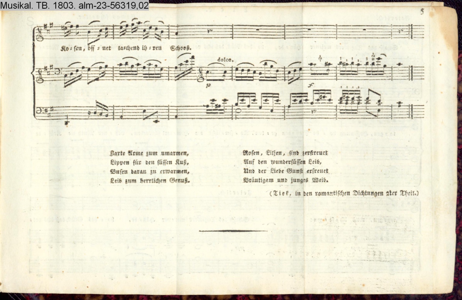 Unter der Musikbeigabe: Tiek, in den romantischen Dichtungen 2ter Theil