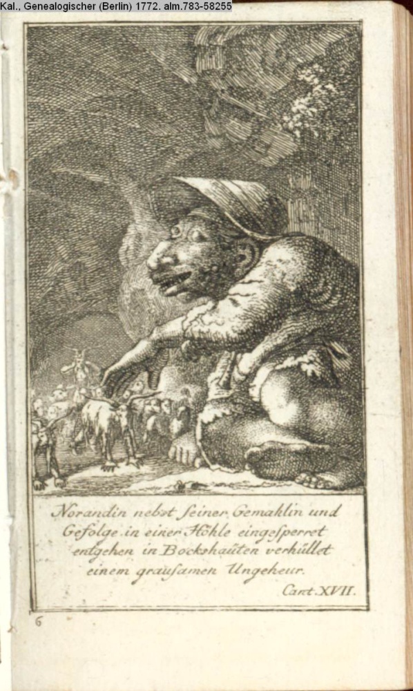 Norandin nebst seiner Gemahlin und / Gefolge in einer Höhle eingesperret / entgehen in Bockshäuten verhüllet / einem grausamen Ungeheuer. / Cant. XVII.