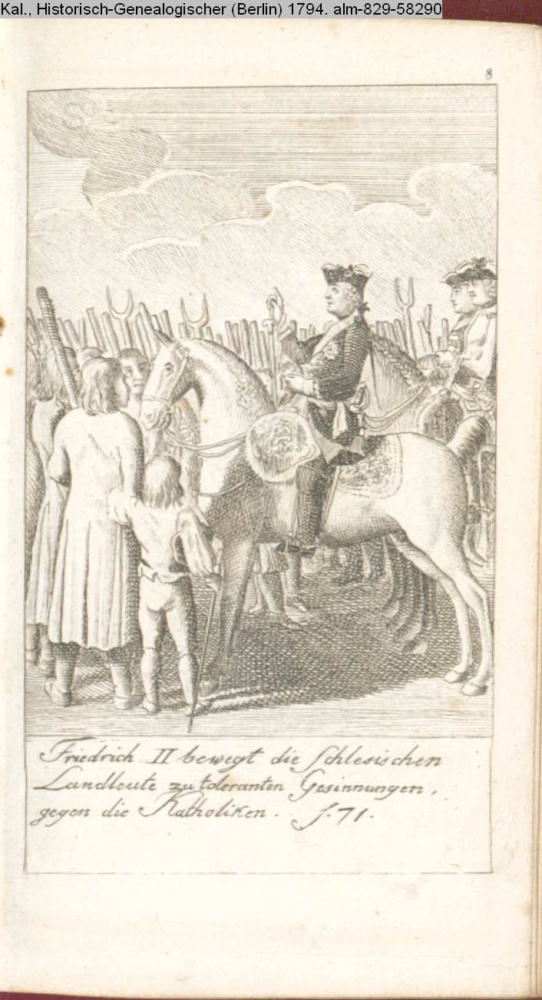 Friedrich II bewegt die schlesischen Landleute zu toleranten Gesinnungen / gegen die Katholiken. S. 71