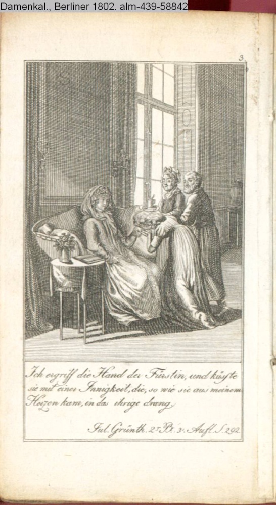Ich ergriff die Hand der Fürstin, und küsste / sie mit einer Innigkeit, die, so wie sie aus meinem / Herzen kam, in das ihrige drang. / Jul. Grünth. 2r. Bd. 3.. Aufl. S. 92