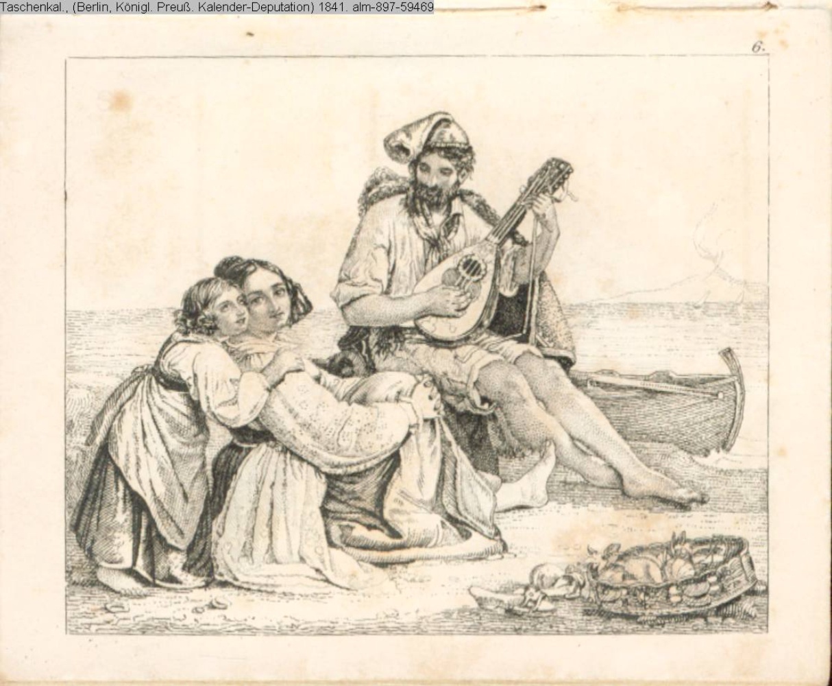 Graphik im Kalendarium August; paginiert 6. # Bez. an Blatt 2 und 7 der Suite. Illustration zu »Neapolitanische Fischerfamlie« von E. Ferrand d.i. Ed. Schulz