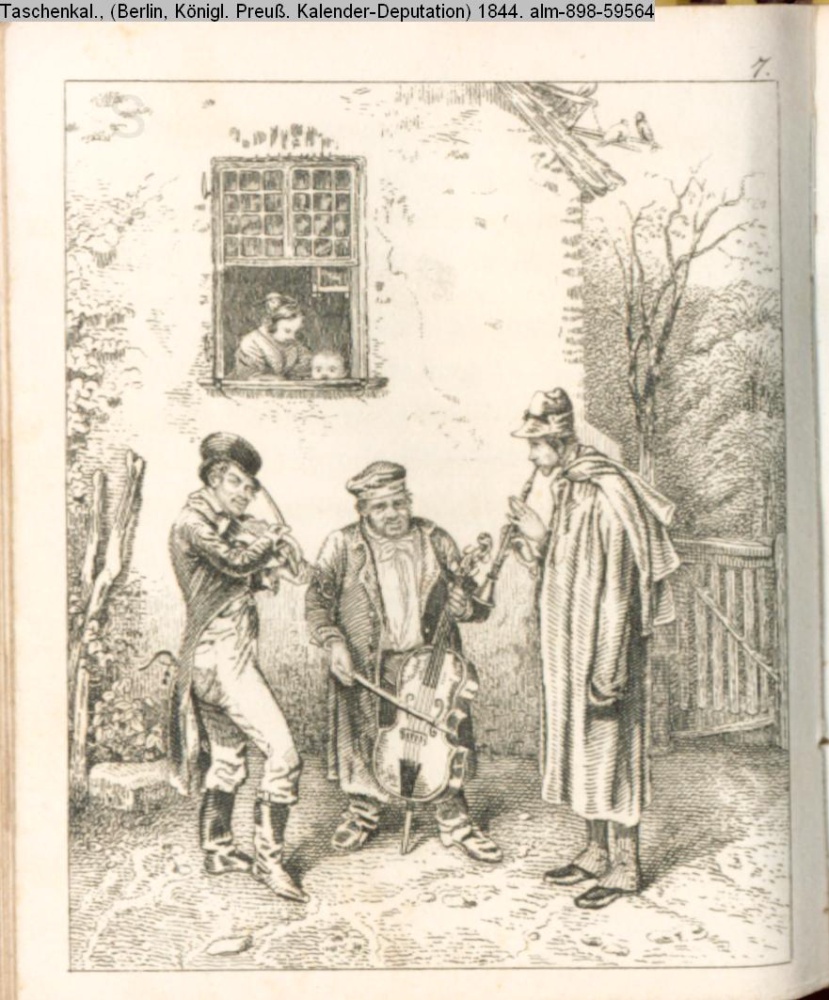 Illustration zu »Die wandernden Musikanten« von E. Ferrand d.i. Ed. Schulz INr 59565, Obj 83 # Titel vom Textbezug
