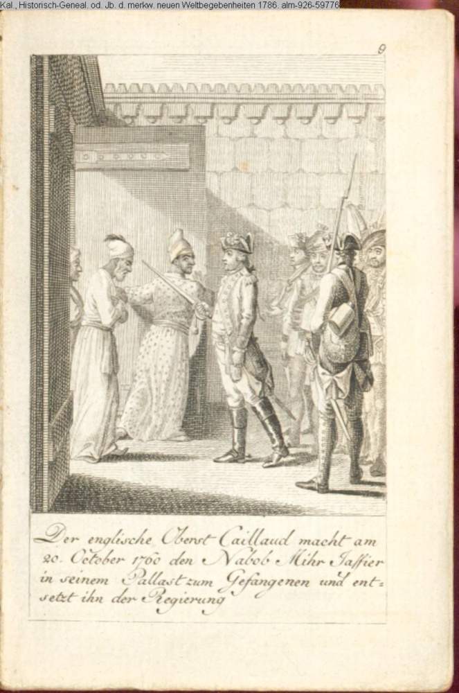 Der englische Oberst Caillaud macht am / 20. October den Nabob Mihr Jassier / in seinem Pallast zum Gefangenen und ent- / setzt ihn der Regierung