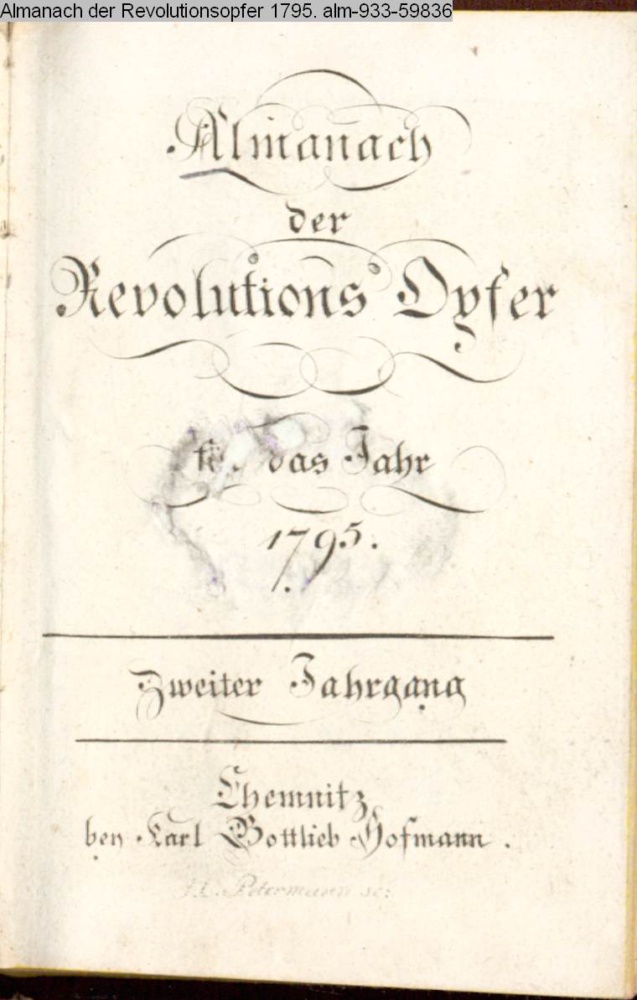Almanach / der / Revolutions Opfer / für das Jahr / 1795. / Zweiter Jahrgang / Chemnitz / bey Karl Gottlieb Hofmann