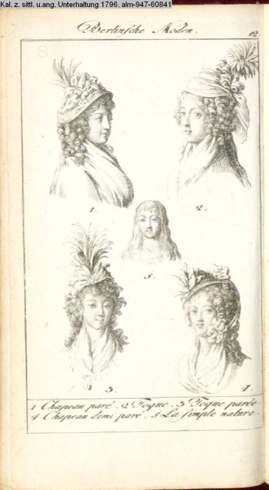 Berlinsche Moden. / 1. Chapeau paré. 2 Toque. 3. Toque parée. / 4 Chapeau demi paré. 5 La simple nature