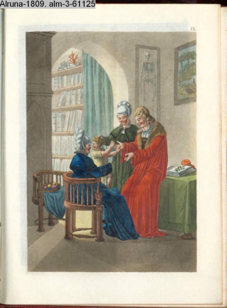 paginiert IX. Illustration zu »Die güldene Halskette. Seitengemälde zur Rückkehr zur Spindel. Nach vorgezeichneten Kupfern. Jutta von Rosenheim« INr 50165, Obj 21