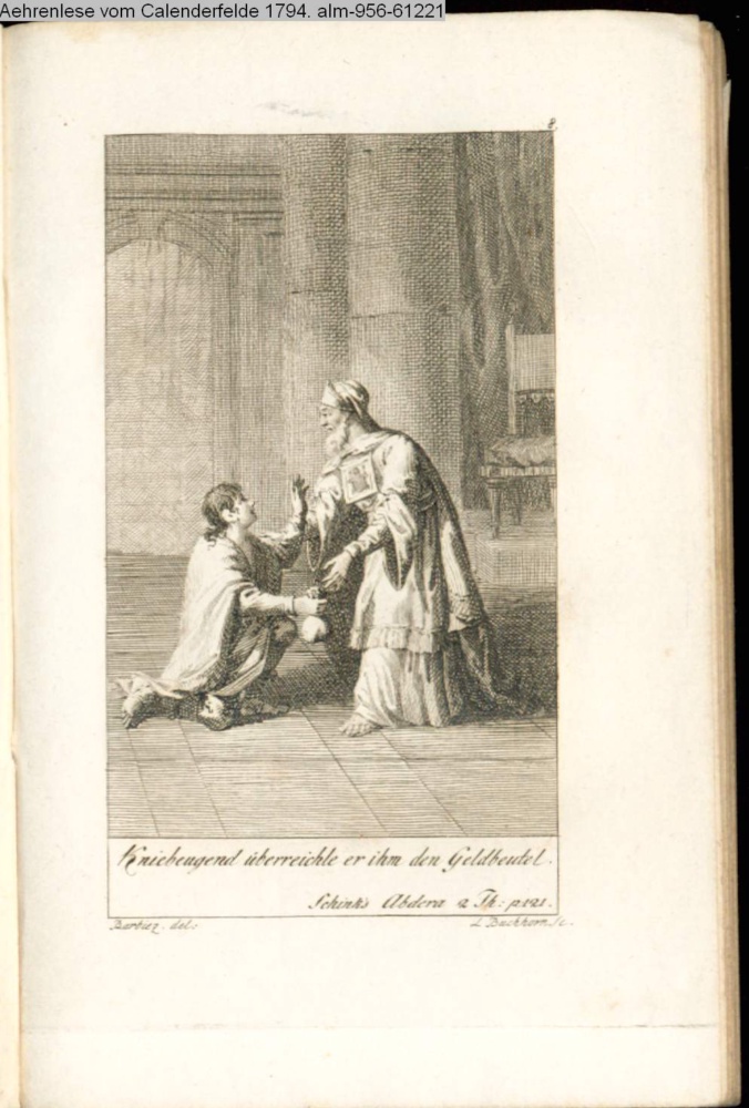 Kniebeugend überreichte er ihm den Geldbeutel. / Schinks Abdera. 2. Th. p. 121