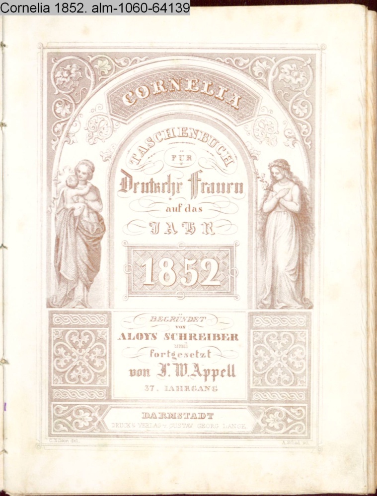 CORNELIA / TASCHENBUCH / FÜR / Deutsche Frauen / auf das / JAHR / 1852 / BEGRÜNDET / VON / ALOYS SCHREIBER / und / fortgesetzt / von J. W. Appell / 37. JAHRGANG / DARMSTADT / DRUCK & VERLAG v. GUSTAV GEORG LANGE