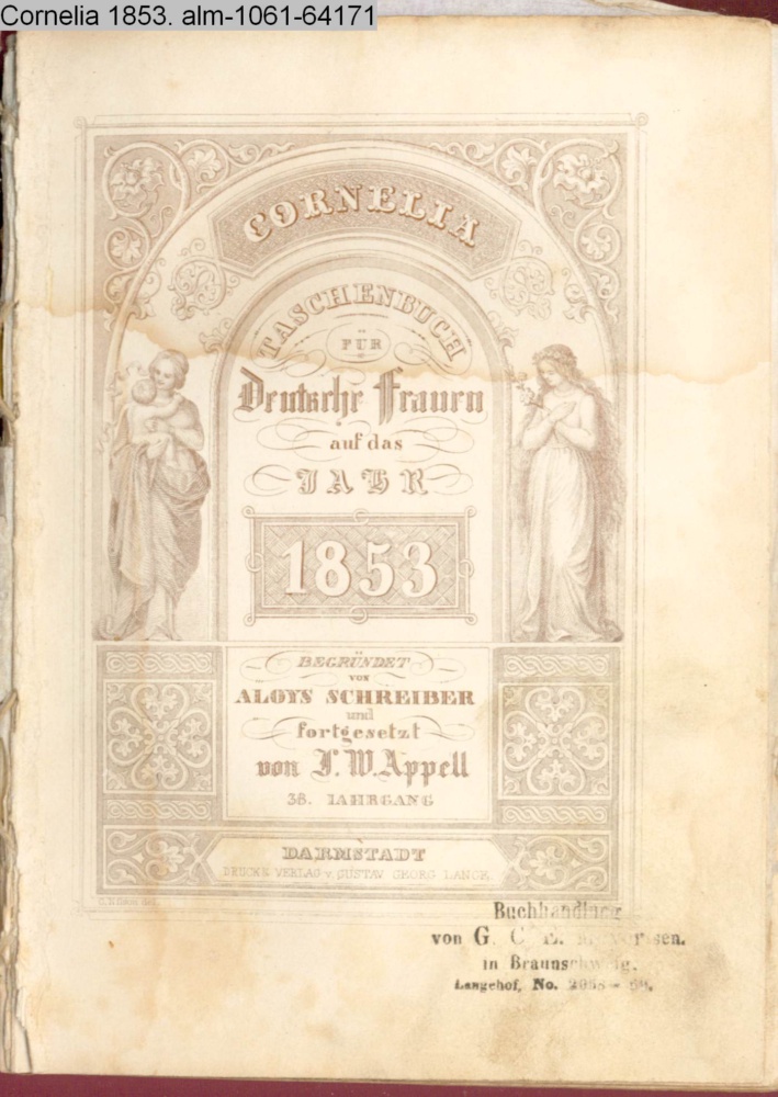 CORNELIA / TASCHENBUCH / FÜR / Deutsche Frauen / auf das / JAHR / 1853 / BEGRÜNDET / VON / ALOYS SCHREIBER / und / fortgesetzt / von J. W. Appell / 38. JAHRGANG / DARMSTADT / DRUCK & VERLAG v. GUSTAV GEORG LANGE