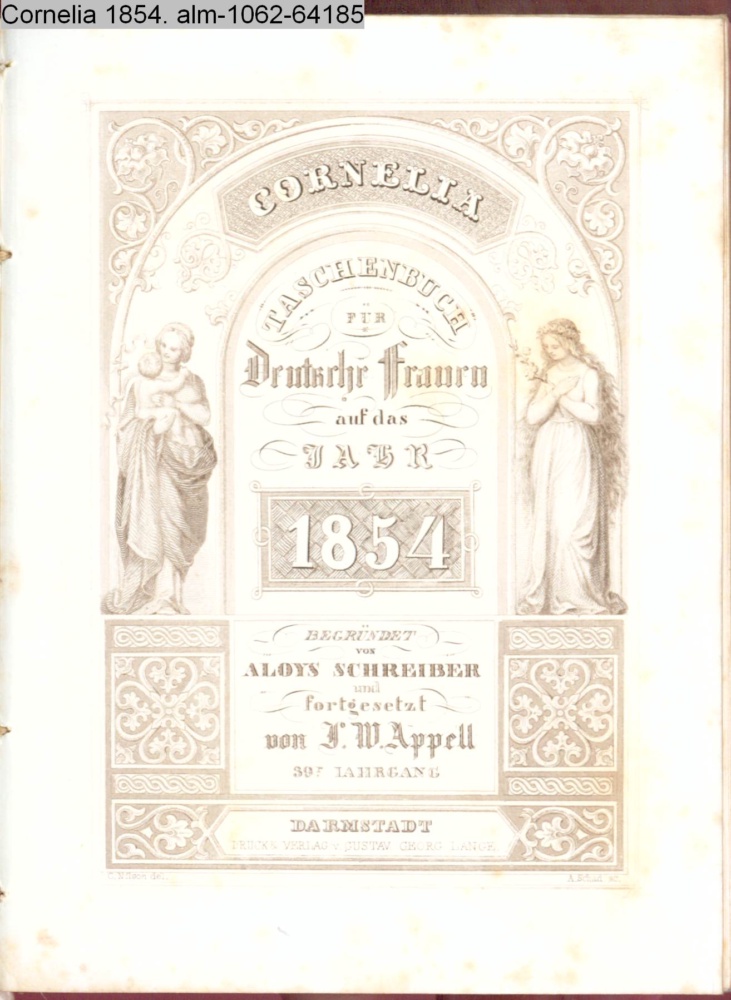 CORNELIA / TASCHENBUCH / FÜR / Deutsche Frauen / auf das / JAHR / 1854 / BEGRÜNDET / VON / ALOYS SCHREIBER / und / fortgesetzt / von J. W. Appell / 39r JAHRGANG / DARMSTADT / DRUCK & VERLAG v. GUSTAV GEORG LANGE
