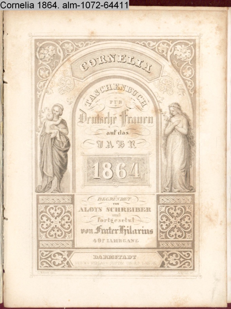 CORNELIA / TASCHENBUCH / FÜR / Deutsche Frauen / auf das / JAHR / 1864 / BEGRÜNDET / VON / ALOYS SCHREIBER / und / fortgesetzt / von Frater Hilarius / 49r JAHRGANG / DARMSTADT / DRUCK & VERLAG v. GUSTAV GEORG LANGE