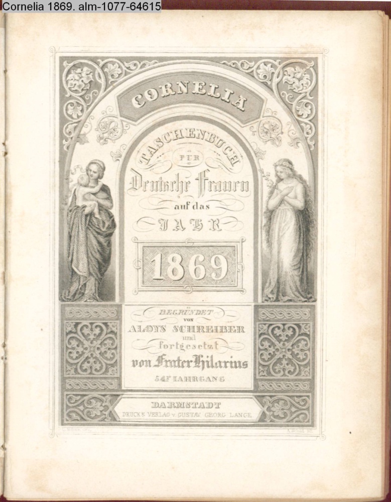 CORNELIA / TASCHENBUCH / FÜR / Deutsche Frauen / auf das / JAHR / 1869 / BEGRÜNDET / VON / ALOYS SCHREIBER / und / fortgesetzt / von Frater Hilarius / 54r JAHRGANG / DARMSTADT / DRUCK & VERLAG v. GUSTAV GEORG LANGE