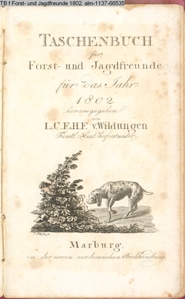 TASCHENBUCH / für / Forst und Jagdfreunde / für das Jahr / 1802 / herausgegeben / von / L. C. E. H. F. v. Wildungen / Fürstl. Hess. Oberforstmeister. / Marburg, / in der neuen academischen Buchhandlung