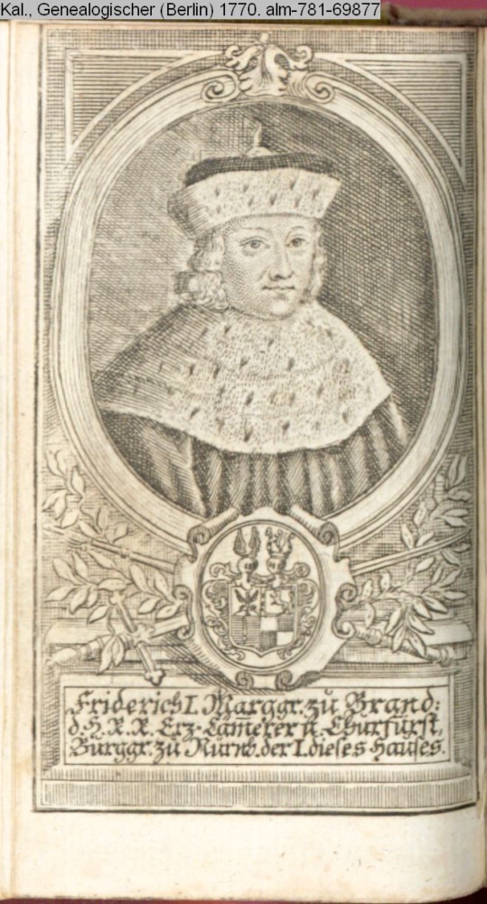 1. Blatt der Suite »Die Durchlauchtigsten Marggrafen zu Brandenburg aus dem Hohenzollerischen Hause Von Friderich I. bis auf Sr. jetztregierenden Maj. König Friderichs. In 14 Kupfern vorgestellet von J. G. Wolfgang Königl. Hof-Kupferstecher in Berlin« INr 69876, Obj 22; s. Anm. dort