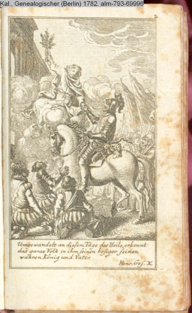 Umgewandelt an diesem Tage des Heils, erkennt / Das ganze Volk in ihm seinen besiger seinen / wahren König und Vater. / Henr. Ges. X.