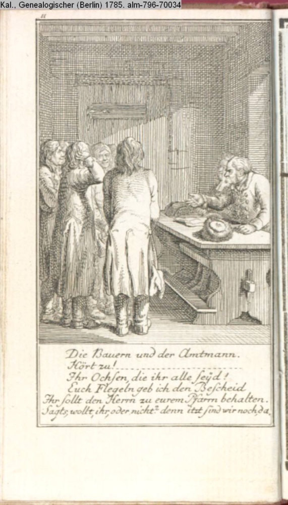 Die Bauern und der Amtmann. / Hört zu! / Ihr Ochsen, die ihr alle seyd! / Euch Flegeln geb ich den Bescheid / Ihr sollt den Herrn zu eurem Pfarrn behalten / Sagts, wollt ihr, oder nicht? denn itzt sind wir noch da