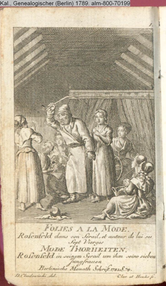 Illustration zu »Mode Thorheiten«, hier zu »Rosenfeld in seinem Serail« aus: Berlinische Monathsschrift 1783 S. 74.