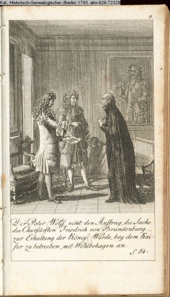 Der Pater Wolff nimmt den Auftrag, die Sache / des Churfürsten Friedrich von Brandenburg / zur Erhaltung der König. Würde, bey dem Kai- / ser zu betreiben, mit Wohlbehagen an. / S. 54