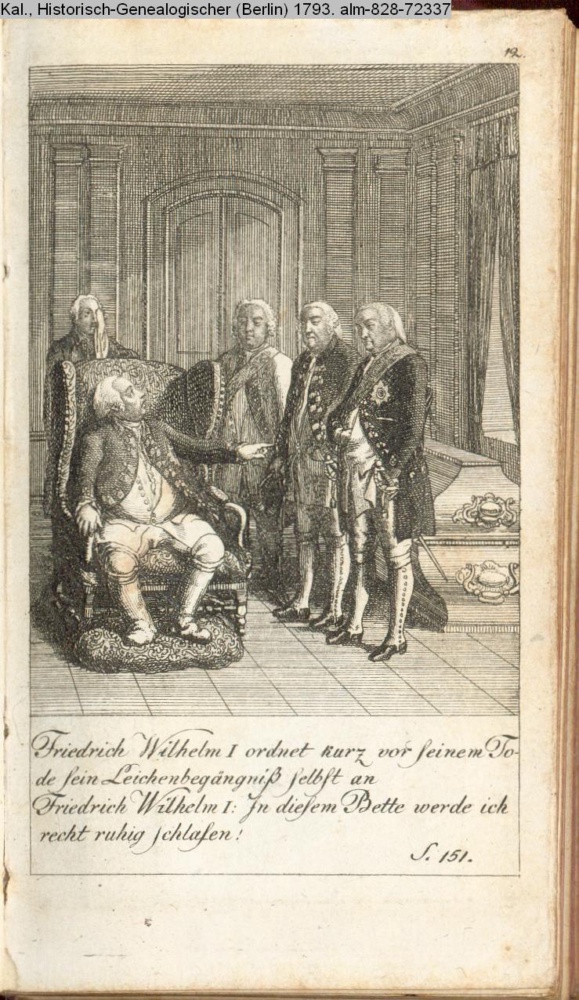 Friedrich Wilhelm I. ordnet kurz vor seinem To- / de sein Leichenbegängniß selbst an. / Friedrich Wilhelm I.: In diesem Bette werde ich / recht ruhig schlafen! / S. 151
