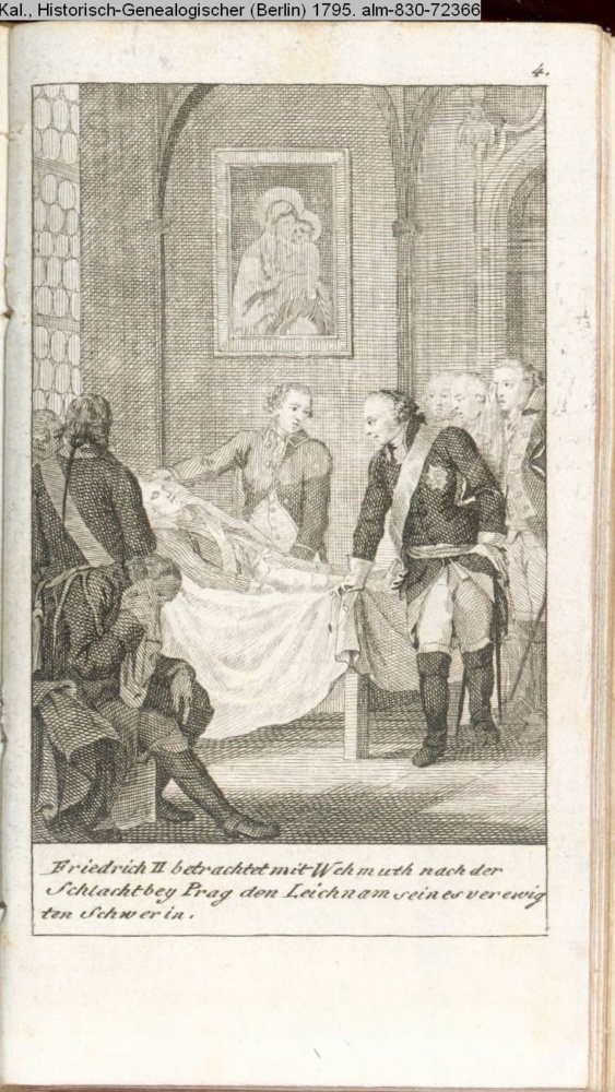 Friedrich II. betrachtet mit Wehmuth nach der / Schlacht bey Prag den Leichnam seines verewig- / ten Schwerin