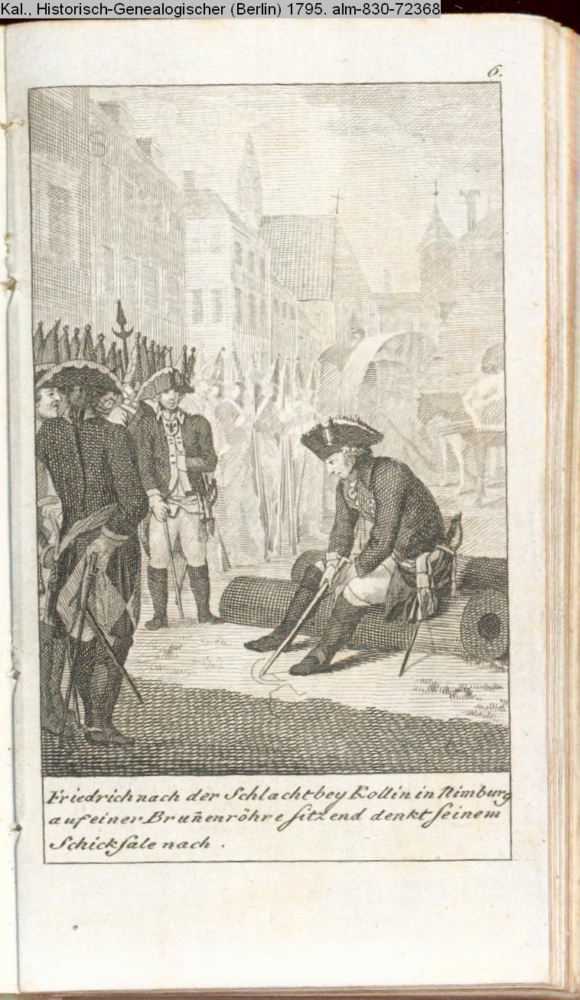 Friedrich nach der Schlacht bey Kollin in Nimburg auf einer Brunnenröhre sitzend denkt / seinem Schicksale nach