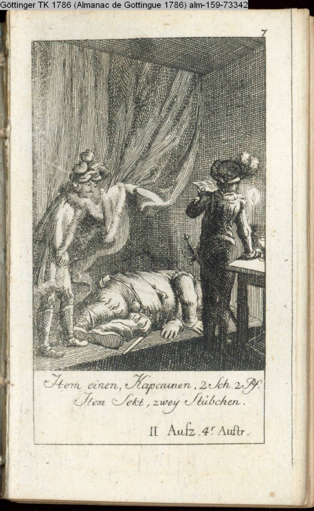 Item einen Kapaunen, 2 Sch 2 Pf. / Item Sekt, zwey Stübchen. / II. Aufz. 4r. Auftr.