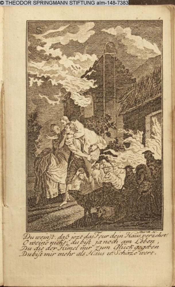 Du weinst, daß jezt das Feur dein Haus verzehrt! / O weine nicht, du bist ja noch am Leben, / Du die der Himmel mir zum Glück gegeben / Du bist mehr als Haus u. Schätze wert.