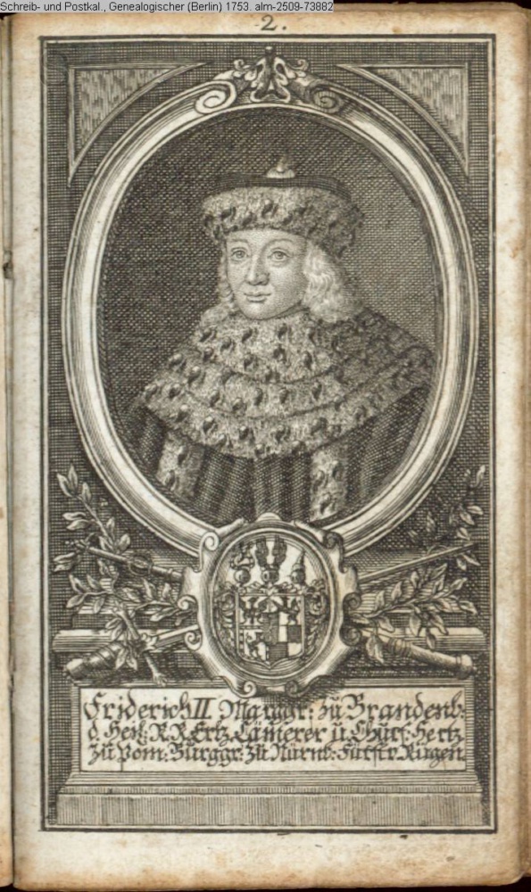 Die durchlauchtigsten Marggrafen Zu Brandenburg aus dem Hohenzollerischen Hause Von Friedrich I. bis auf Sr. jetztregierenden Maj. König Friderichs. In 14 Kupfern vorgestellet von J. G. Wolfgang Königl. Hof-Kupferstecher in Berlin (Sammlung INr 73880, Obj 27) s. Textbezug INr 73897, Obj 44