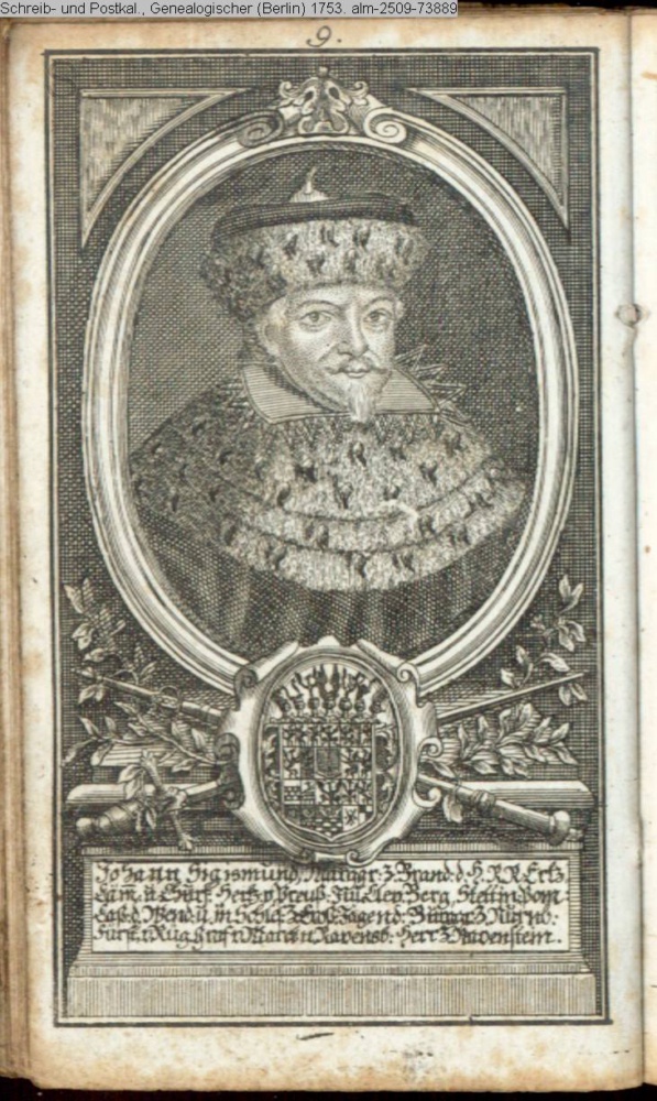 Johann Sigismund Marggr. z. Brand. d. H. R. R. Ertz / Cämm. u. Churf. Hertz. v. Preuß. Jül. Clev. Berg, Stettin. Pom. / Caß. d. Wend. in Schles. z. CroßJägernd. Burggr. z. Nürnb. / Fürst v. Rüg. Graf v. Marck u. Ravensb. Herr z. Ravenstein