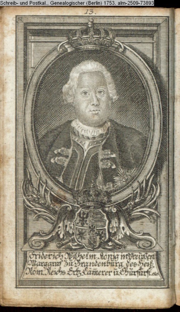 Die durchlauchtigsten Marggrafen Zu Brandenburg aus dem Hohenzollerischen Hause Von Friedrich I. bis auf Sr. jetztregierenden Maj. König Friderichs. In 14 Kupfern vorgestellet von J. G. Wolfgang Königl. Hof-Kupferstecher in Berlin (Sammlung INr 73880, Obj 27) s. Textbezug INr 73908, Obj 55